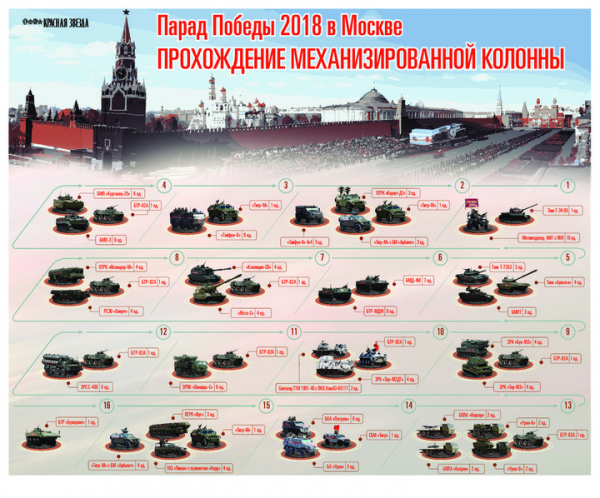 Парад Победителей 24 июня 1945 года, в котором участвовало 40 тысяч военнослужащих, заложил традицию торжественного прохождения войск в День Победы 9 мая по главной площади страны. В этом году по брусчатке Красной площади пройдет 14 тысяч военнослужащих, представляющих все виды и рода войск . Прогрохочет по брусчатке и грозная военная техника. Завершится парад пролетом боевой авиации, включая самолеты, вертолеты и беспилотники. Полный состав парадного расчета представлен на инфографике Минобороны России.