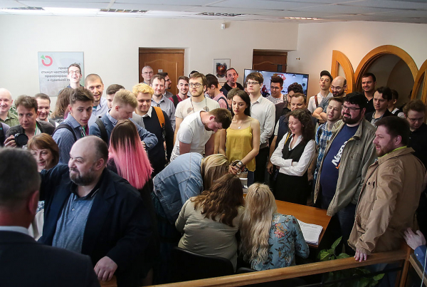 Небольшой зал, помимо делегатов, заполнили рядовые члены "Яблока", сторонники Каца, скучковавшиеся в дальней части зала.