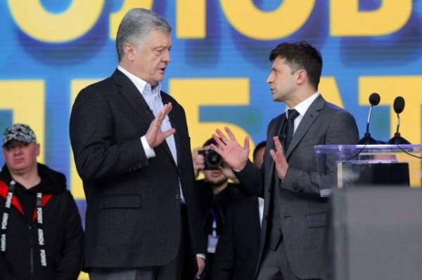 Зеленский в своем выступлении назвал себя «результатом ошибок и обещаний» президента Порошенко. Он сказал, что в 2014 году сам голосовал за него, но ошибся. Участвовать в выборах он решил, чтобы сломать существующую систему. Порошенко, в свою очередь, назвал Зеленского «красивой оберткой» и обвинил его в том, что тот якобы уклонялся от службы в армии.